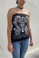 - Style Description: Y2K McBling Cross & Angel Wing RhineStone Print Side Shirred Tube Top