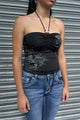 • Style Description: Y2K Off-The-Shoulder Flowy Sleeve Top with O-Ring Beaded Neck Tie